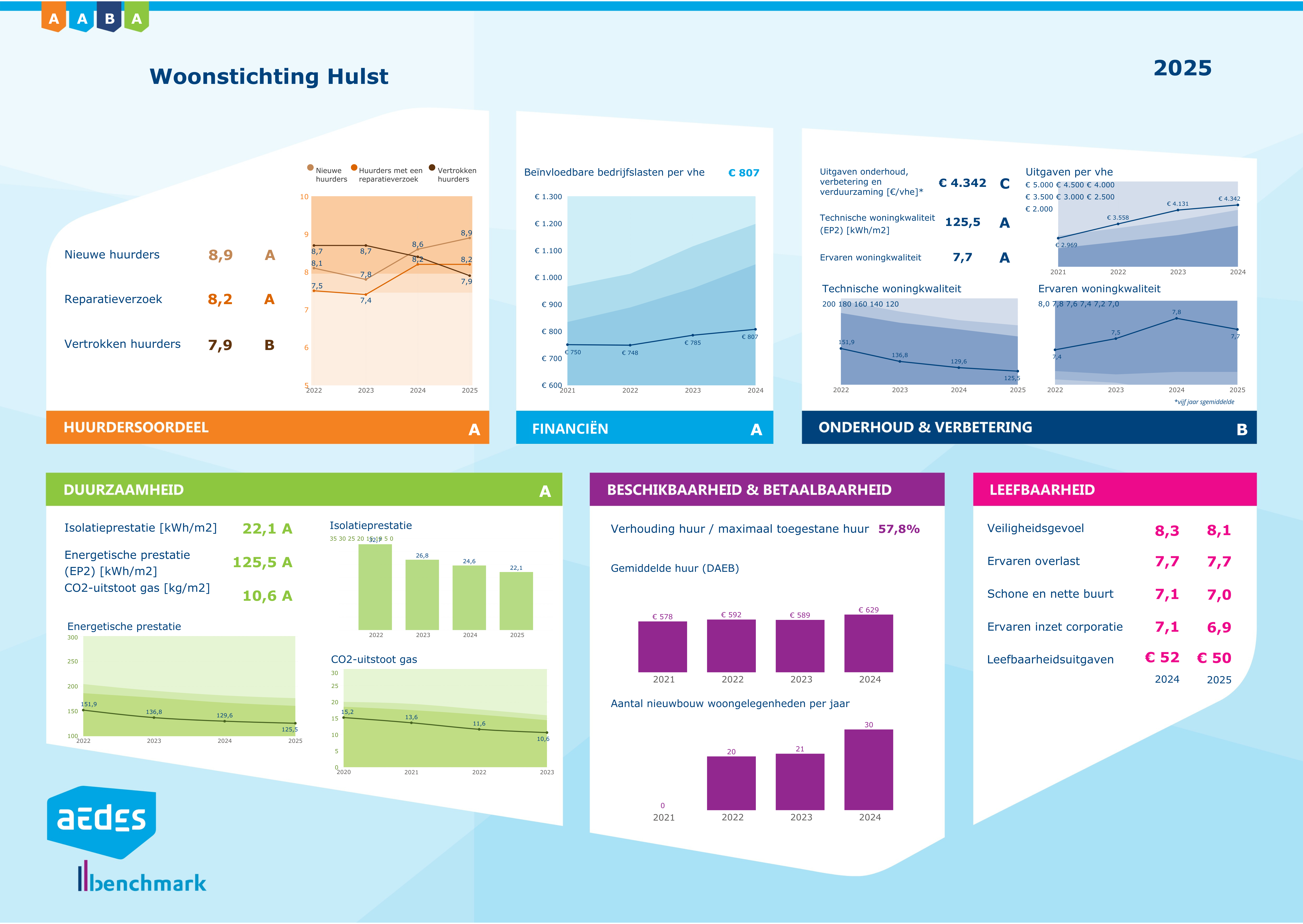 Woonstichting Hulst heeft wederom uitstekende resultaten behaald in de Aedes Benchmark. De organisatie krijgt A’s voor huurdersoordeel, bedrijfslasten en duurzaamheid. Ook de leefbaarheid in de wijken wordt door huurders positief beoordeeld.